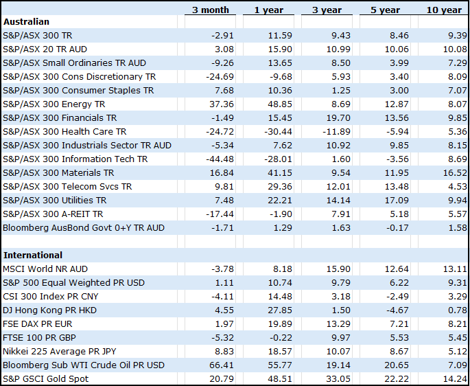 Reflecting that, Australian share market sector performance dispersion was extreme, with Energy (+34.9%), Utilities (+8.5%) and Consumer Staples (+8.1%) the strongest performers, while Information Technology (-27.9%), Healthcare (-16.9%) and Property (-17.1%) were the hardest hit.
