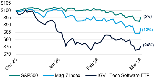 Figure 1: US Software Shares v Mag-7 v S&P500 share price performance (March quarter)